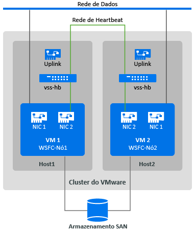 Para criar uma rede de heartbeat, você pode configurar Switches Padrão do vSphere (vSS) de forma idêntica em cada host e incluir um grupo de portas de máquina virtual para a rede de heartbeat em cada switch. Cada host contribui com uma NIC disponível a ser usada como uplink, que é necessário para comunicação entre nós nos hosts. Configure a segunda NIC em cada VM para usar a rede de heartbeat.