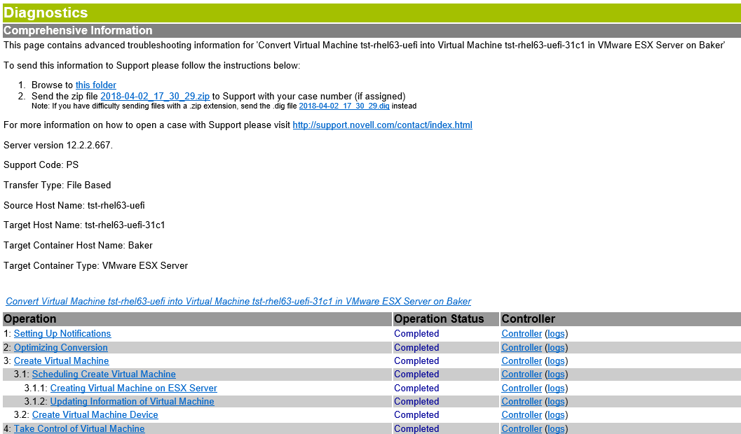 O PlateSpin Migrate dispõe de uma ferramenta capaz de produzir um relatório de diagnóstico para qualquer job em execução ou concluído.