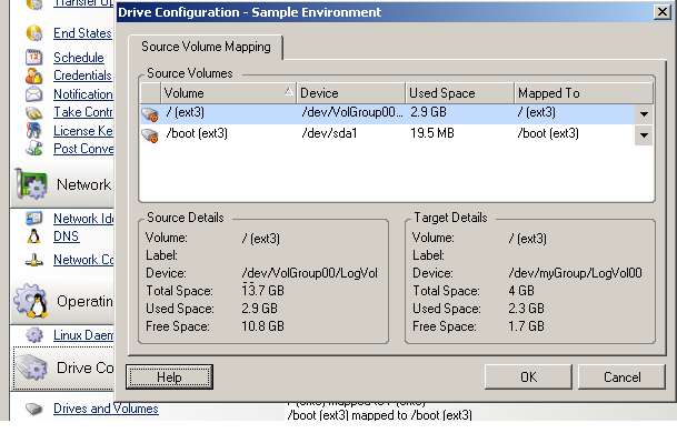 Um job de Server Sync para cargas de trabalho do Linux fornece informações detalhadas de volume e de ponto de montagem para a origem e o destino e permite especificar o mapeamento necessário.