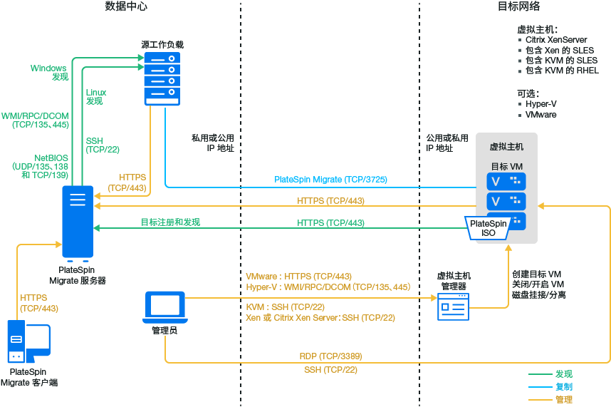 注:图 14-1图 14-2 描绘了 Windows 及 Linux 工作负载的自动发现和网络要求。您也可以使用源工作负载上的 Migrate 代理来注册工作负载,并使用 HTTPS (TCP/443) 将其库存细节发送到 PlateSpin Migrate 服务器。请参见部分 2.6.2, 工作负载注册的要求部分 22.7, 使用 Migrate 代理注册工作负载并发现细节