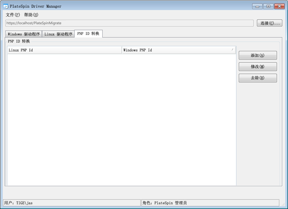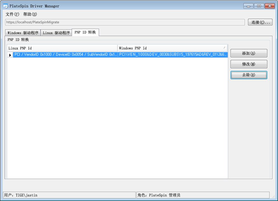 在 Driver Manager 工具中,选择“PNP ID 转换”选项卡以打开 PNP ID 转换列表,该列表中包含当前已知的自定义 PNP ID 映射。