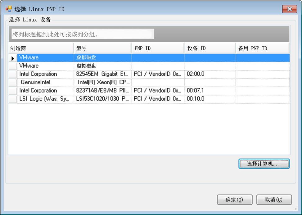 高亮显示列表中的某个设备,然后单击选择填充“选择 Linux PnP ID”对话框中的列表。