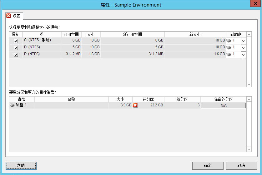 使用这些设置可以选择要复制的源卷、要重创建和调整大小的非卷源空间,以及要重分区和填充的目标磁盘。