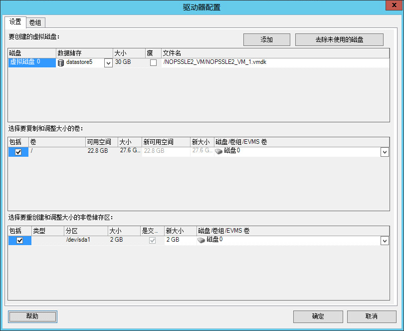 使用这些设置可以选择迁移期间要复制和调整大小的卷与非卷源空间。如果源上安装了 LVM,卷组选项卡中会提供相应的选项。