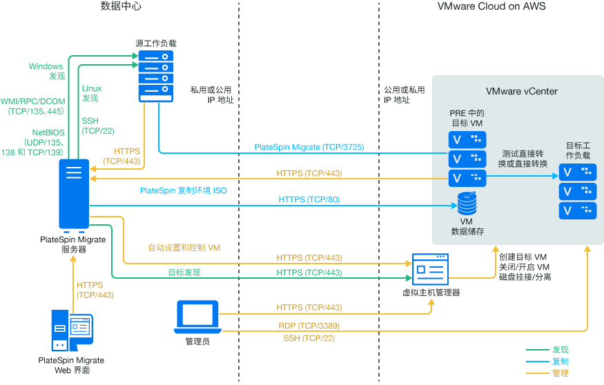 图 13-1 显示了自动化 VMware 迁移环境中各个组件的位置及其相互通讯的方式。仅支持通过 PlateSpin Migrate Web 界面自动迁移到 VMware Cloud (VMC) on AWS。
