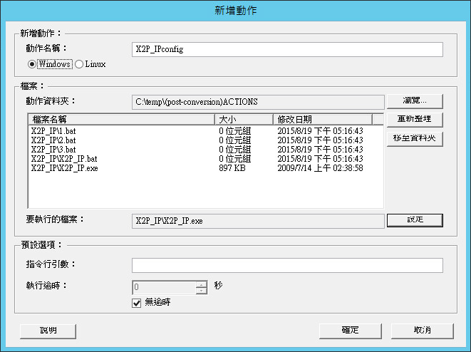 4. 在「新增動作」視窗中,輸入自訂動作的名稱,選取目標作業系統類型,然後瀏覽到並選取包含所需動作及其相依項的目錄。