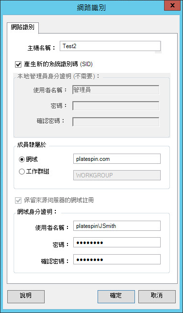 主機名稱︰為目標機器指定所需的主機名稱。 產生新的 SID:如果選取此選項,將會為目標工作負載指定新的系統識別碼 (SID)。僅當移轉 Windows 2008 時才需要身分證明,而且它們必須是本地 (內嵌式) 管理員帳戶的身分證明。如果已在來源本地重新命名此帳戶,請提供新名稱。 成員隸屬於 (網域/工作群組):選取所需的選項,並輸入您希望目標機器加入之網域或工作群組的名稱。 保留來源伺服器的網域註冊:保留網域註冊,並確保來源伺服器網域註冊在移轉期間保持不變。如果停用此選項,來源機器的網域帳戶將會傳輸至目標機器。來源伺服器可能仍在網域中,但不會建立有效的連接。 網域身分證明︰如果目標機器屬於某個網域,請指定有權將伺服器新增至該網域的使用者帳戶的有效身分證明,例如網域管理員群組或企業管理員群組的成員。 |