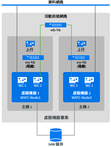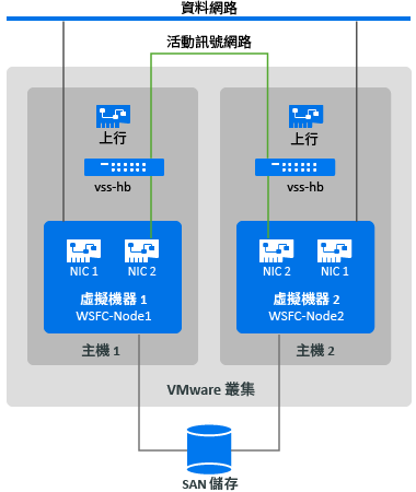 若要建立活動訊號網路,您可在每部主機上以相同的方式設定 vSphere 標準交換器 (vSS),並在每個交換器中為活動訊號網路新增一個虛擬機器連接埠群組。每部主機提供一個可用的 NIC 做為上行鏈路,在跨主機的節點之間通訊時,需要使用該上行鏈路。將每個虛擬機器上的第二個 NIC 設定為使用活動訊號網路。