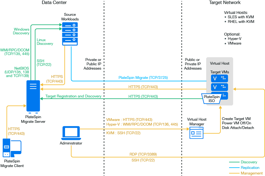 NOTE:Figure 15-1 depicts automated discovery and the network requirements for Windows and Linux workloads. You can alternatively use Migrate Agent on the source workload to register the workload and send its inventory details to PlateSpin Migrate server using HTTPS (TCP/443). See Section 2.6.2, Requirements for Workload Registration and Section 19.7, Registering Workloads and Discovering Details with Migrate Agent.