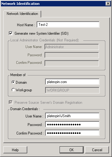 Host Name: Specify the desired host name for the target machine. Generate New SID: When this option is selected, the target workload is assigned a new System Identifier (SID). Credentials are required only for Windows 2008, and must be the credentials for the local (embedded) Administrator account. If this account has been locally renamed on the source, provide the new name. Member of (Domain / Workgroup): Select the required option and type the name of the domain or workgroup that you want the target machine to join. Preserve Source Server’s Domain Registration: Preserves domain registration and ensures that the source server domain registration remains intact during migration. If you disable this option, the source machine’s domain account is transferred to the target machine. The source server still appears to be on the domain, but does not have a valid connection. Domain Credentials: If the target machine is to be part of a domain, specify valid credentials for a user account with permission to add servers to the domain, such as a member of the Domain Admins group or Enterprise Admins group. |