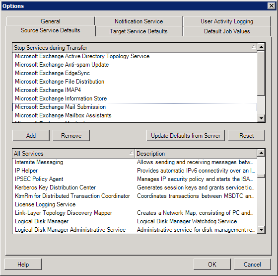 Stop Services during Transfer section: Lists services that are stopped by default. To stop a service during data transfer that uses a specific transfer method by default, select the corresponding check box. A deselected check box means the service remains active during data transfer. All Services section: Lists unique services on all discovered machines. Click Add to add a selected service from the lower section to the upper section and set it to stop during the migration. Update Defaults from Server: Retrieves defaults from PlateSpin Server. |