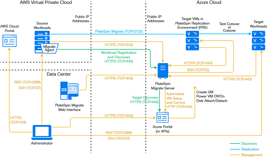 You use Migrate Agent to register workloads with the cloud-based Migrate server using secure communications over the public Internet. Enable data transfer encryption to transfer data securely between the source workload in AWS and the PlateSpin Replication Environment in Azure over the public Internet.