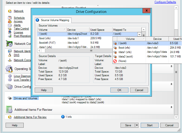 In the Drive Configuration section of the Migration Job window, click the Volume Mapping or Drives and Volumes option displayed depending on the target type.