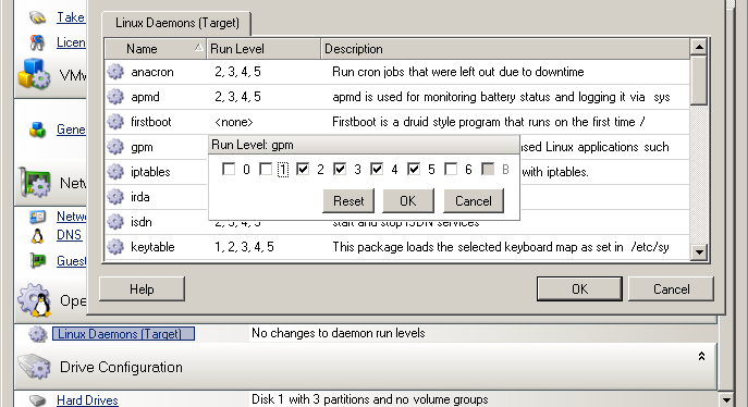 Select Linux daemons’ start conditions on the target VM. Enable the daemon to start by selecting the check boxes at the appropriate runlevels (0 to 6) and Boot.