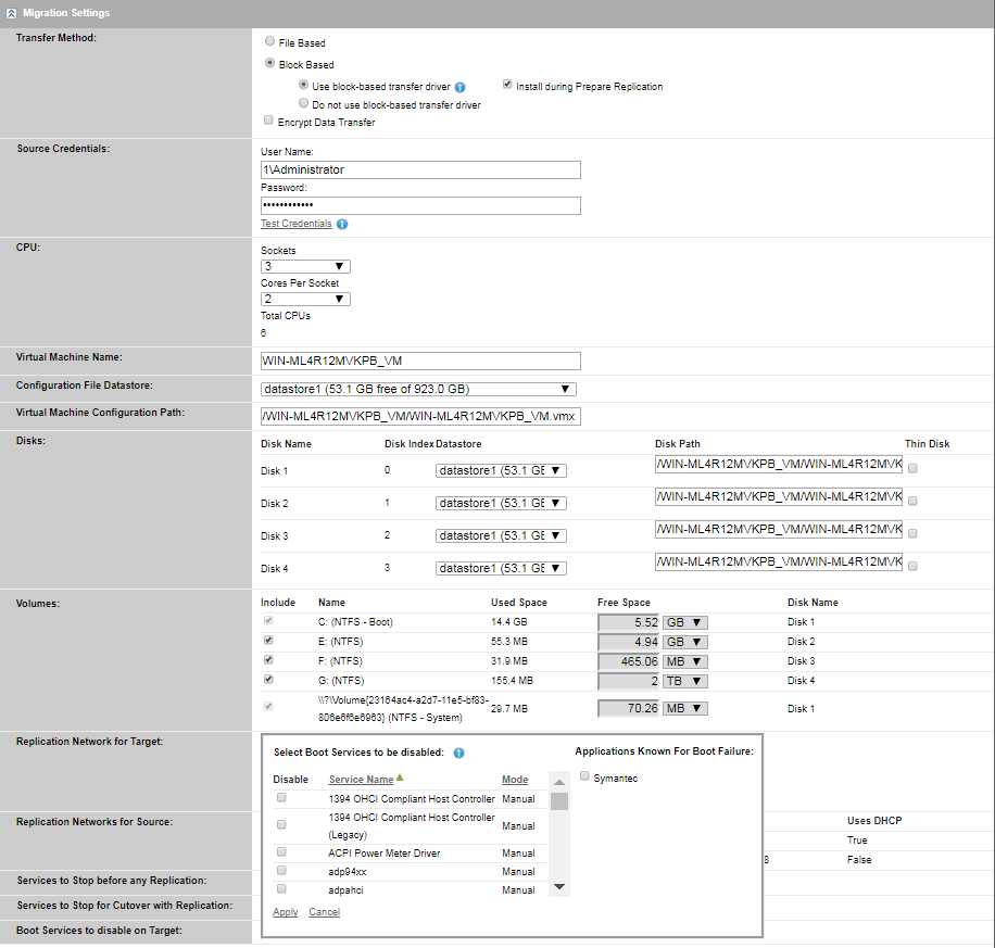 On the Edit Migration Details, go to Migration Settings > Boot Services to Disable on Target.
