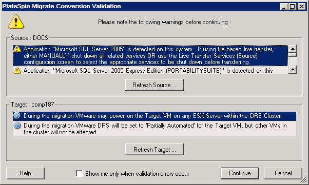 In a default PlateSpin Migrate configuration, validation messages display at the bottom of the Action window. However, If you have configured PlateSpin Migrate to bypass the Action window on drag-and-drop, errors and warnings are displayed in a separate window: