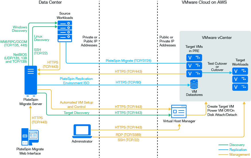 Figure 13-1 shows the location of various components in your automated VMware migration environment and the communications between them. Automated migration to VMware Cloud (VMC) on AWS is supported only by PlateSpin Migrate Web Interface.