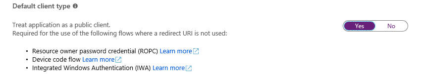 Click Yes to treat the application as a public client.