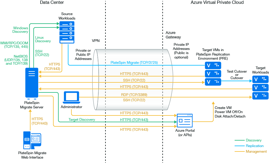 For an on-premise Migrate server deployment, a site-to-site VPN connection is required between the data center and your account in the Azure cloud. Figure 9-1 shows the location of various components in your Azure migration environment and the communications between them. See Section 9.2.5, Azure Prerequisites for Using an On-Premise Migrate Server.