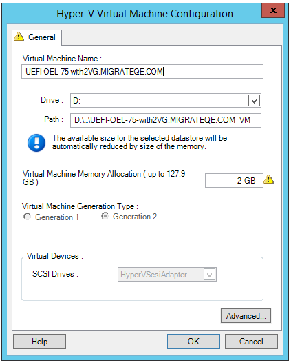 PlateSpin Migrate displays target virtual machine configuration options specific to the selected target and also provides access to advanced configuration options. For information about host-specific configuration options, see Target VM Configuration: Microsoft Hyper-V.