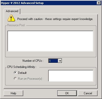 CPU Scheduling Affinity: Represents which Hyper-V Server processors the virtual machine can run on (if your Hyper-V Server is a multiprocessor system). Specify the required processor or select Default (recommended).