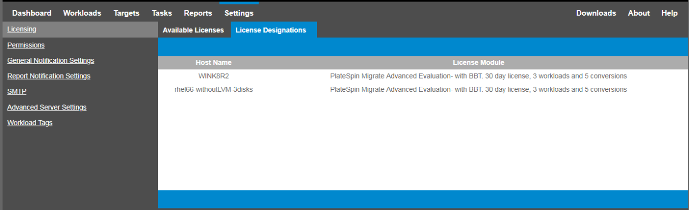 In the PlateSpin Migrate Web Interface, click Settings > Licensing > License Designations to view license allocations for workloads.