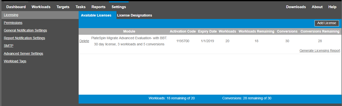 The Licensing tab displays the license name (Module) along with its activation code, expiry date, and the number entitlements (workload licenses available, workload licenses used, workload licenses remaining, conversions available, conversions used, and conversions remaining) for workload migration.