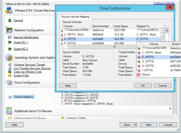 In the Drive Configuration section of the Migration Job window, click the Volume Mapping or Drives and Volumes option displayed depending on the target type.