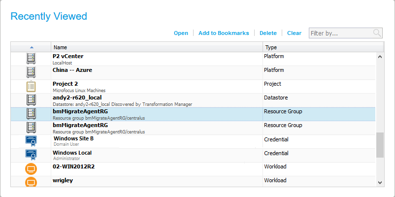 The Recently Viewed panel in the Dashboard displays links to pages and dialogs that the logged-in user has recently accessed for View or Edit actions. Duplicate instances with the same URL are represented by a single entry. You can quickly return to a location without repeating the navigation or complex search criteria. You can share the URL with colleagues, or add the link to your bookmarks. Transformation Manager honors the role-based permissions when it displays the page.