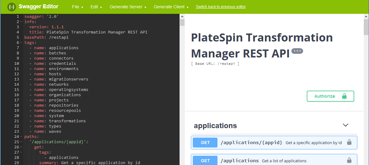 A simple example of a Python script to import workloads is available (with annotations) on the PlateSpin Transformation Manager Appliance in the <connector-path>\resources\ folder. It demonstrates how to use the REST APIs for PlateSpin Transformation Manager to import workloads for a single project. All values are sample values. You must replace them with information for your own project. We used Python for the example, but you can use any of the available programming languages supported by the Swagger Editor.