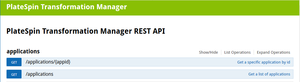 This is the same type of information displayed when you visit the REST API location on your PlateSpin Transformation Manager server at http://<your-ptmserver-ip-address-or-fqdn>:8082/restapi.
