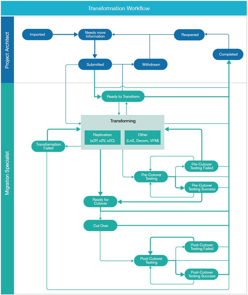 The Migration Specialists execute and monitor the workload transformation processes. For automated migrations, they monitor workloads as they progress through the automated transformation workflow, and intercede as needed. For external migrations on Migrate servers, Transformation Manager tracks the state information. For manual migrations, they can manually enter different state information about the work in progress.